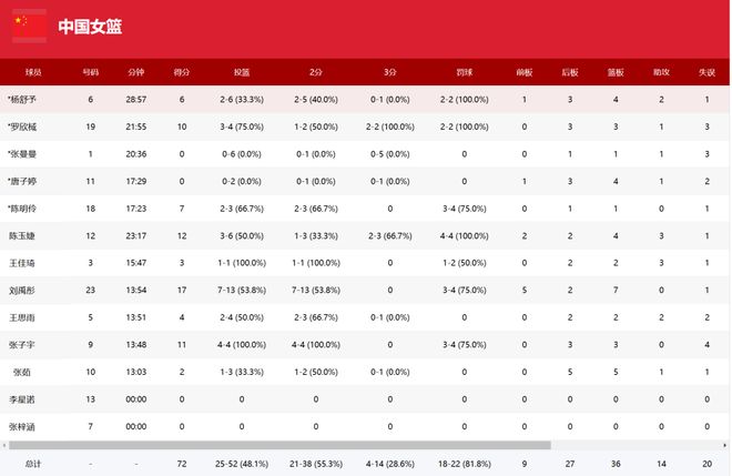 但中国队的表现并不稳定。从单节比赛看,中国队在第二节以20比9取得绝对优势,但其余三节表现一般,在下半场两节更是以14比16、14比18全面落后。尤其是在第四节刘禹彤和张子宇都显得体力不支的情况下,内外线失去稳定得分点,场面一度略显被动。
